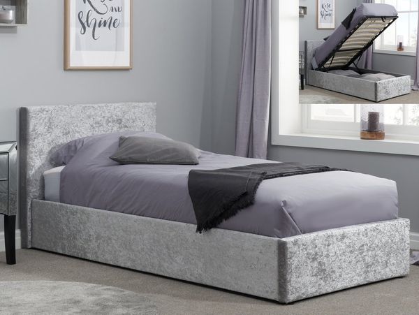 Majestically upholstered in an eye-catching Silver Crushed Velvet, the Berlin Ottoman Bed Frame oozes style whilst still retaining practicality thanks to its spacious storage.